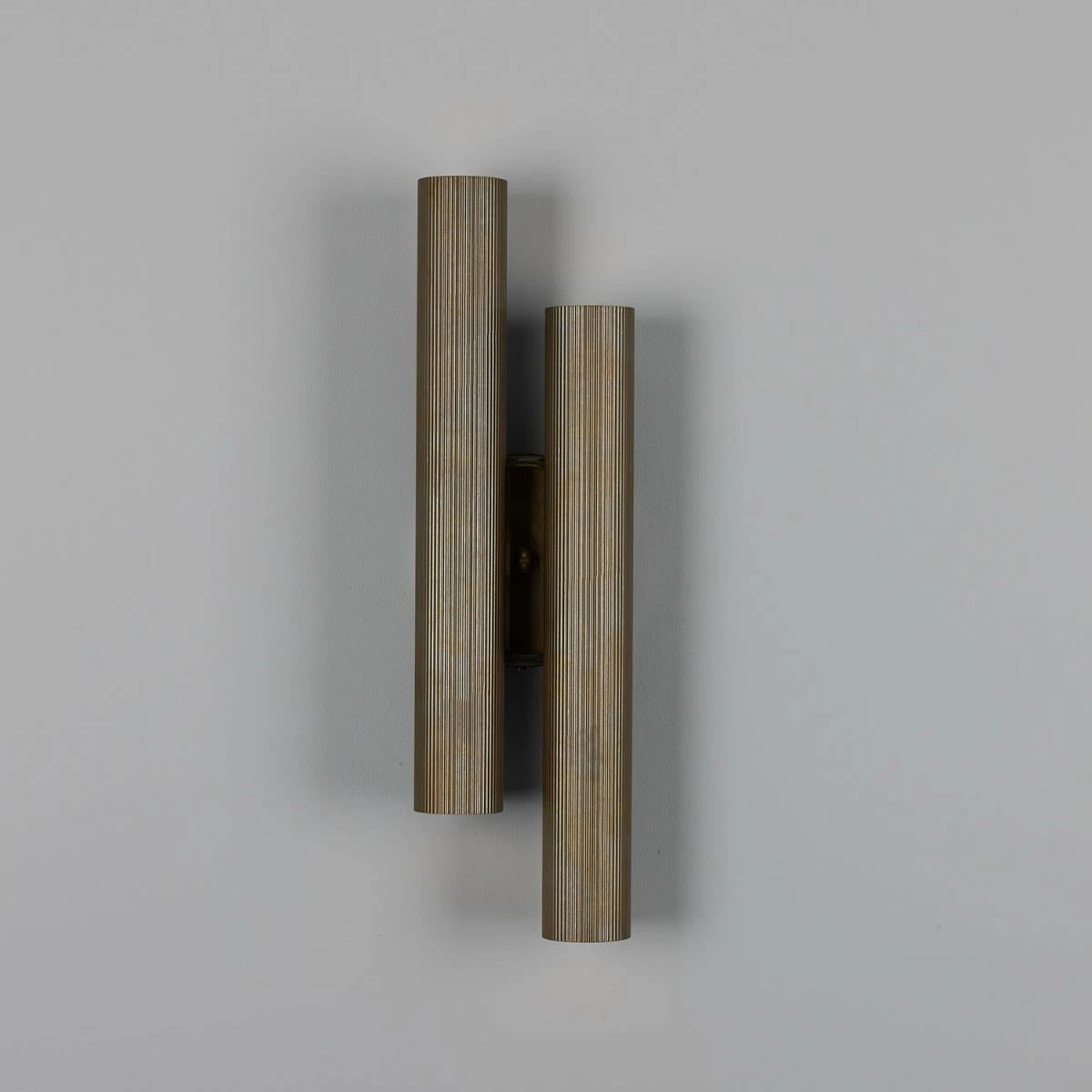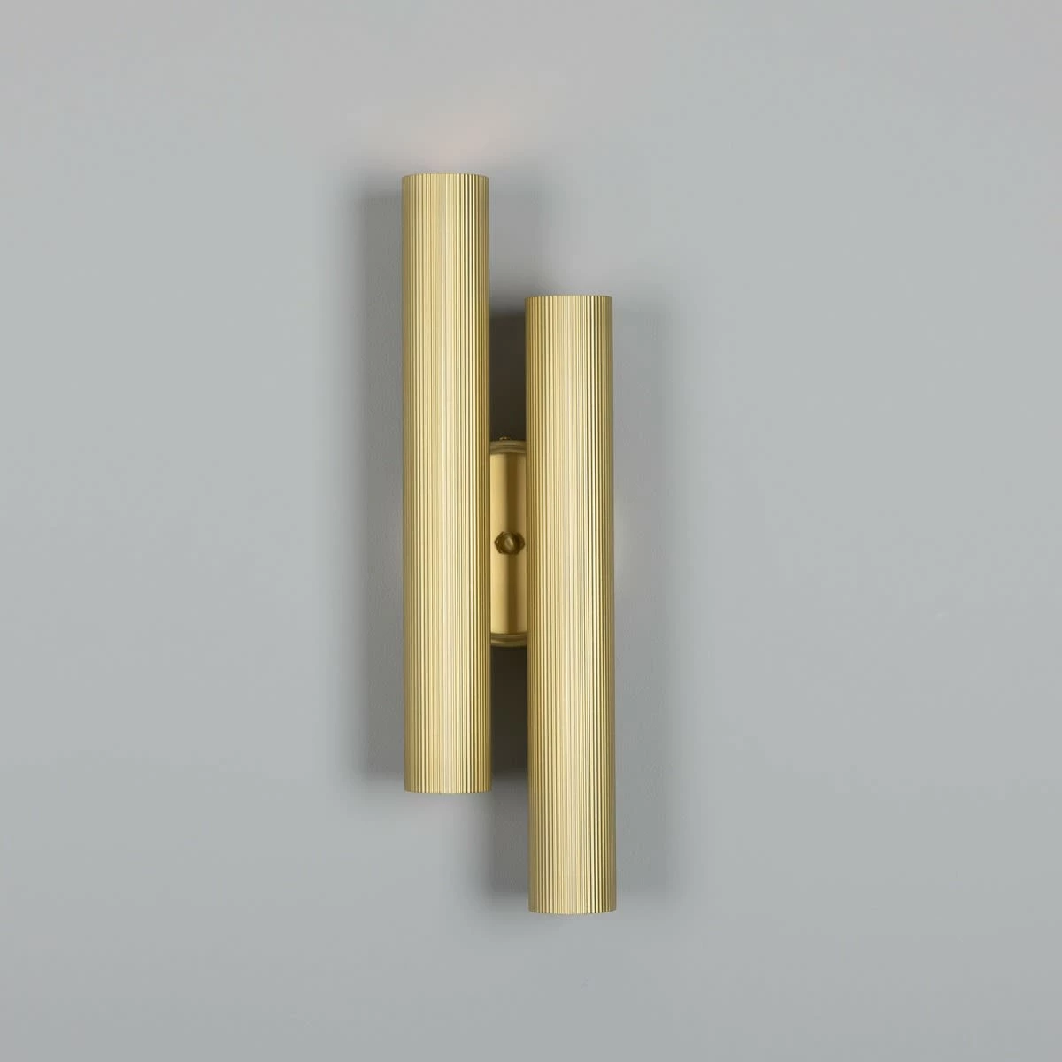The Royce double wall light is a modern design featuring two 2″ reeded brass tubes positioned at alternating heights for added visual appeal.