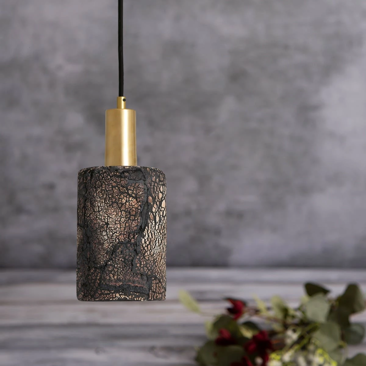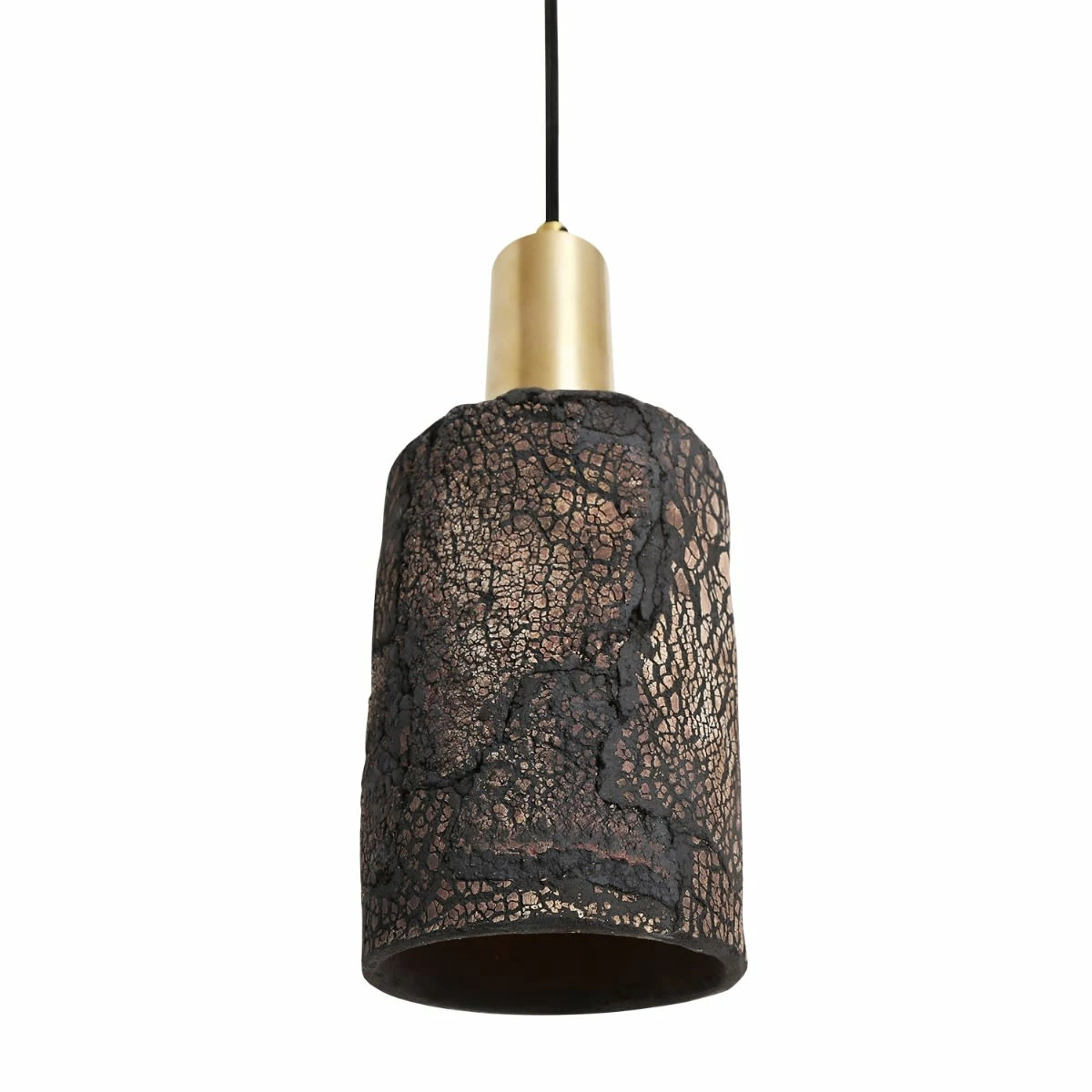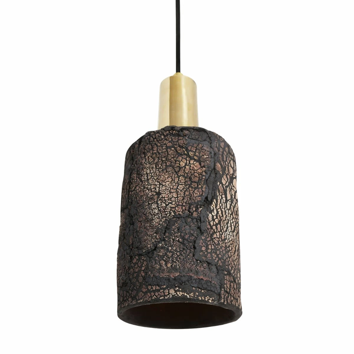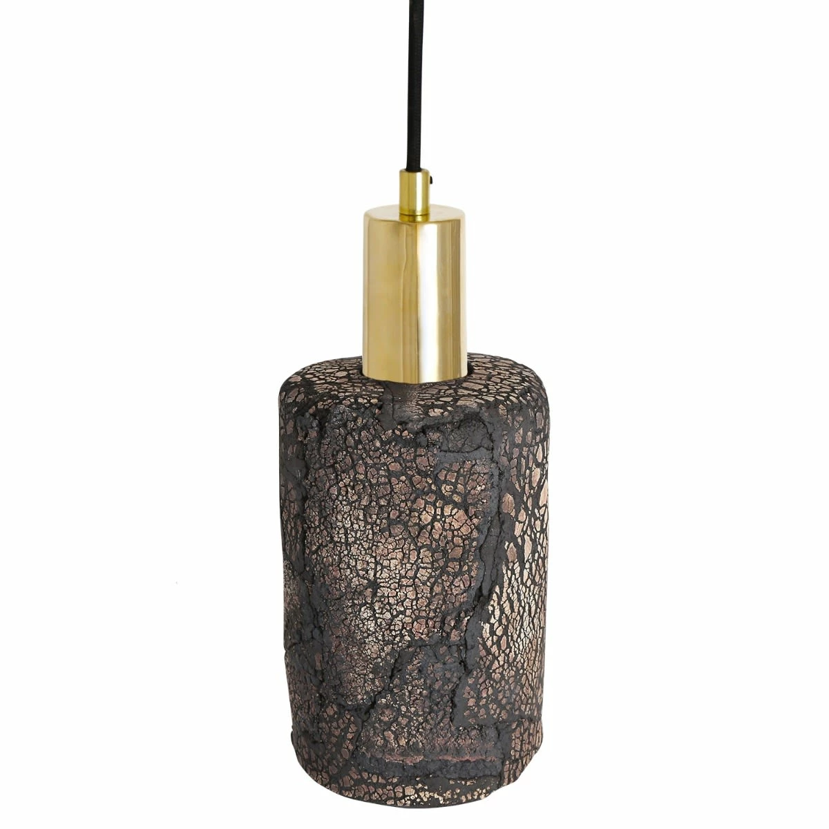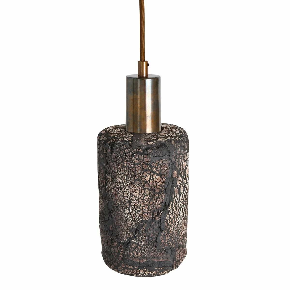 The Senna ceramic pendant light is cylindrical in shape with unique scorched markings. The rustic charm associated with the Senna pendant yearns from coarse textured cracks that coat the exterior of this ceramic pendant.
