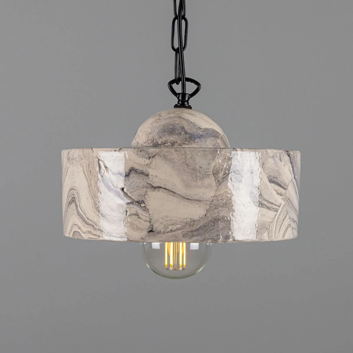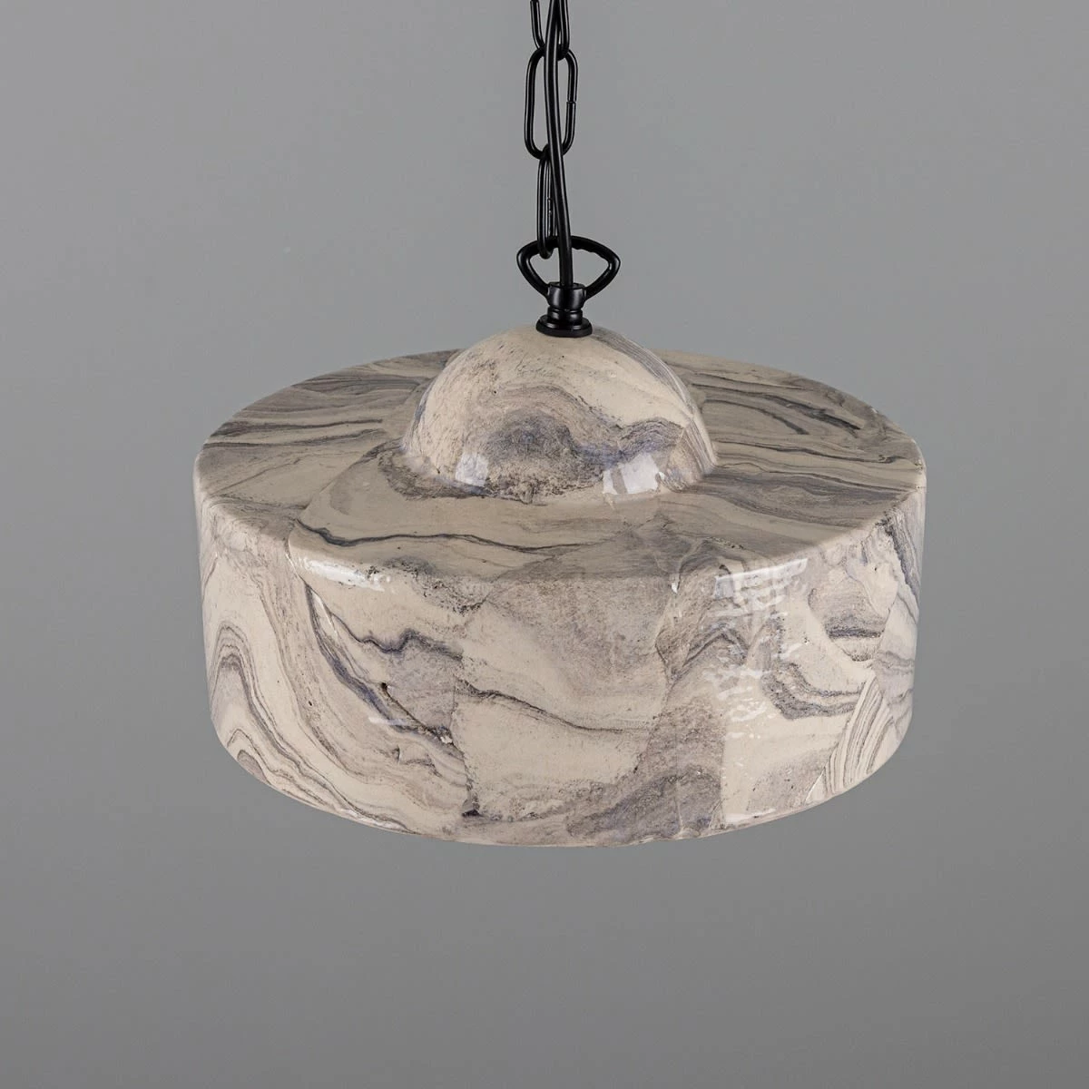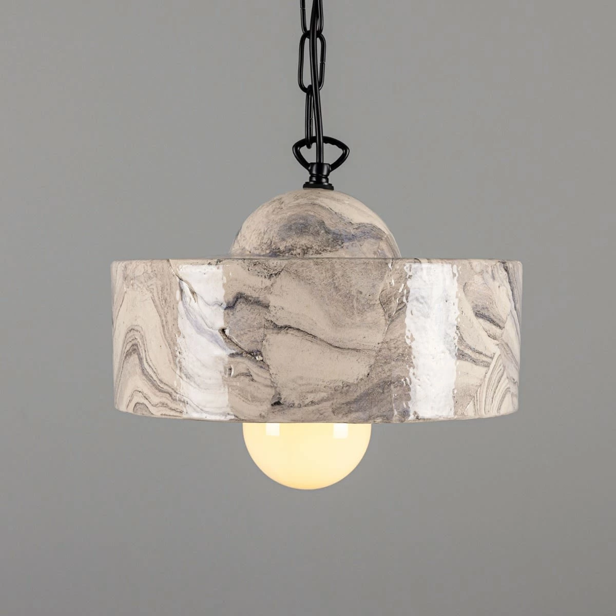 The soft glazed sheen on the ceramic shade highlights the dark black and grey hues on its marbled surface.