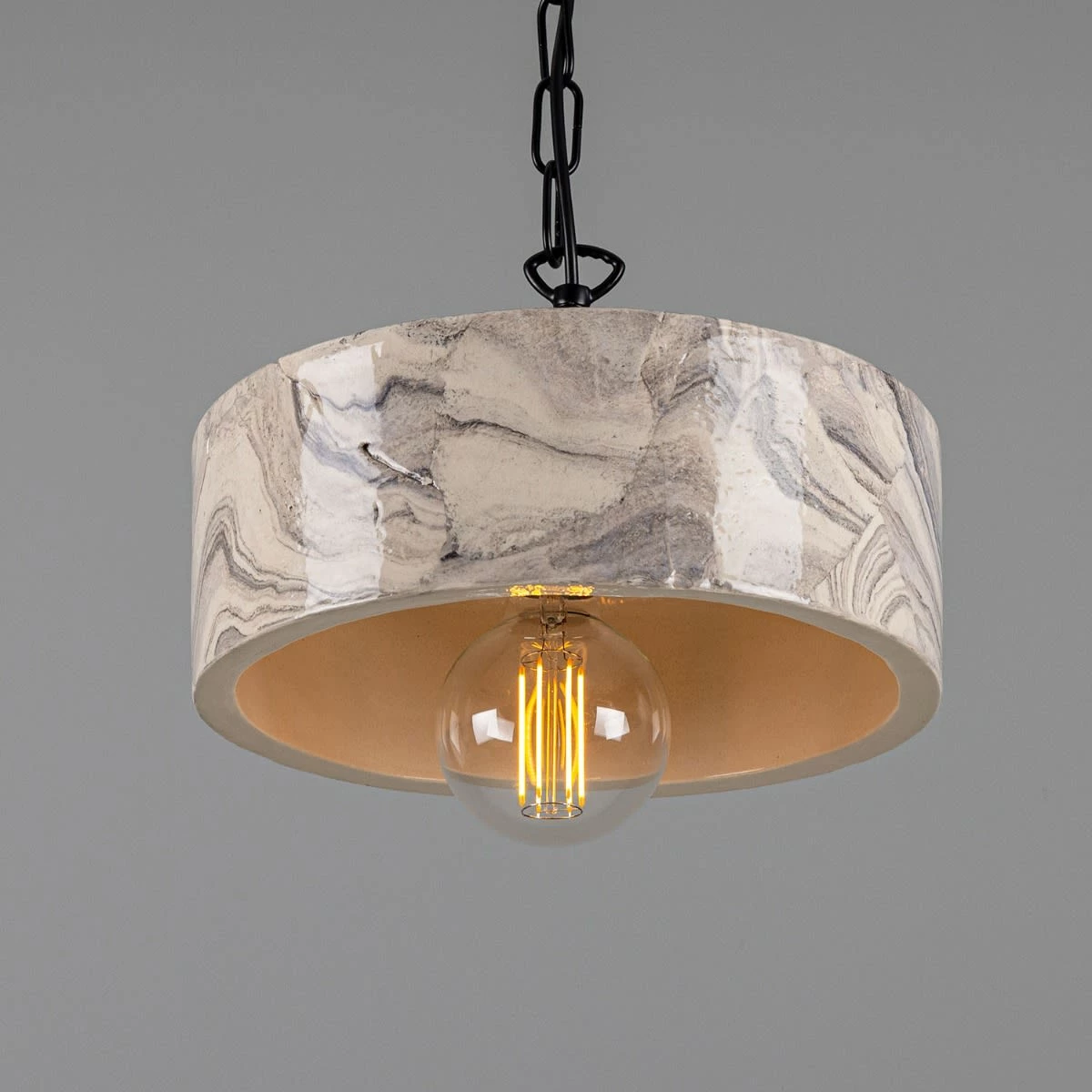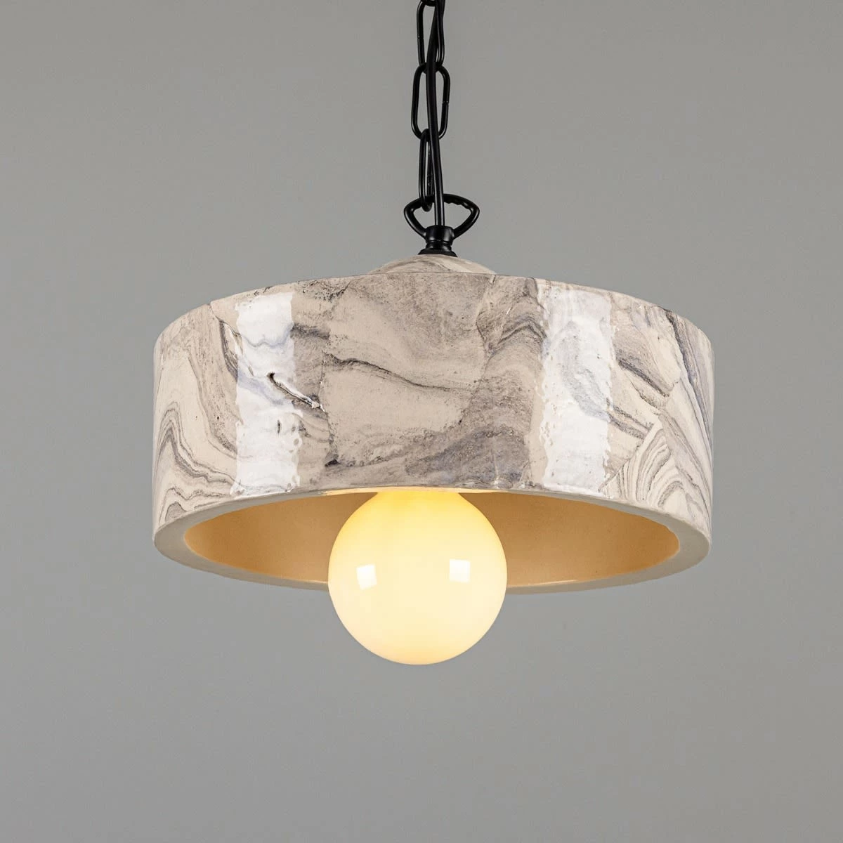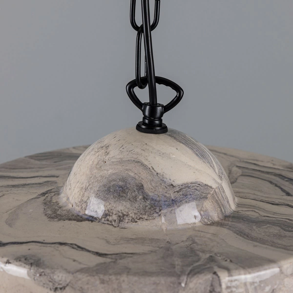 The soft glazed sheen on the ceramic shade highlights the dark black and grey hues on its marbled surface.