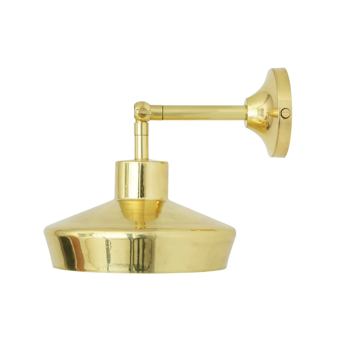 The Splendor wall light is a small, modern wall light with an adjustable arm. This modern light fixture features a brass arm that protrudes from a concave-shaped wall bracket. An angular brass hat is attached to an adjustable swivel joint that allows the Splendor wall light to be adjusted up or down.