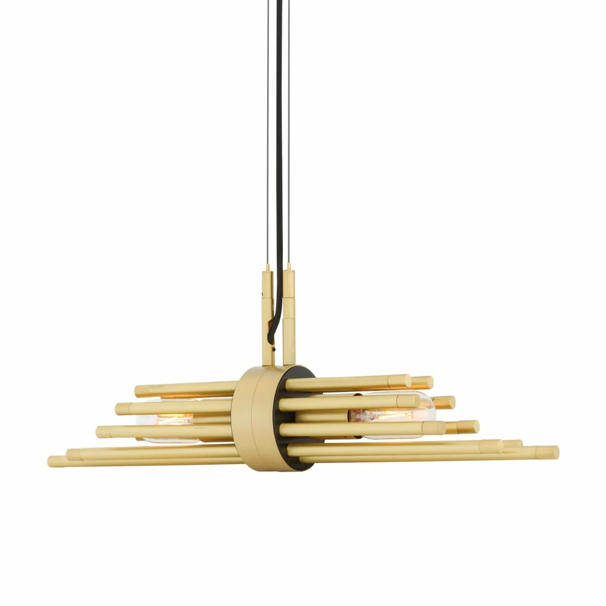 The Victoria is a stylish brass pendant that features nine brass sleeves of varying lengths that project from the light fixture’s cylindrical body on both sides.