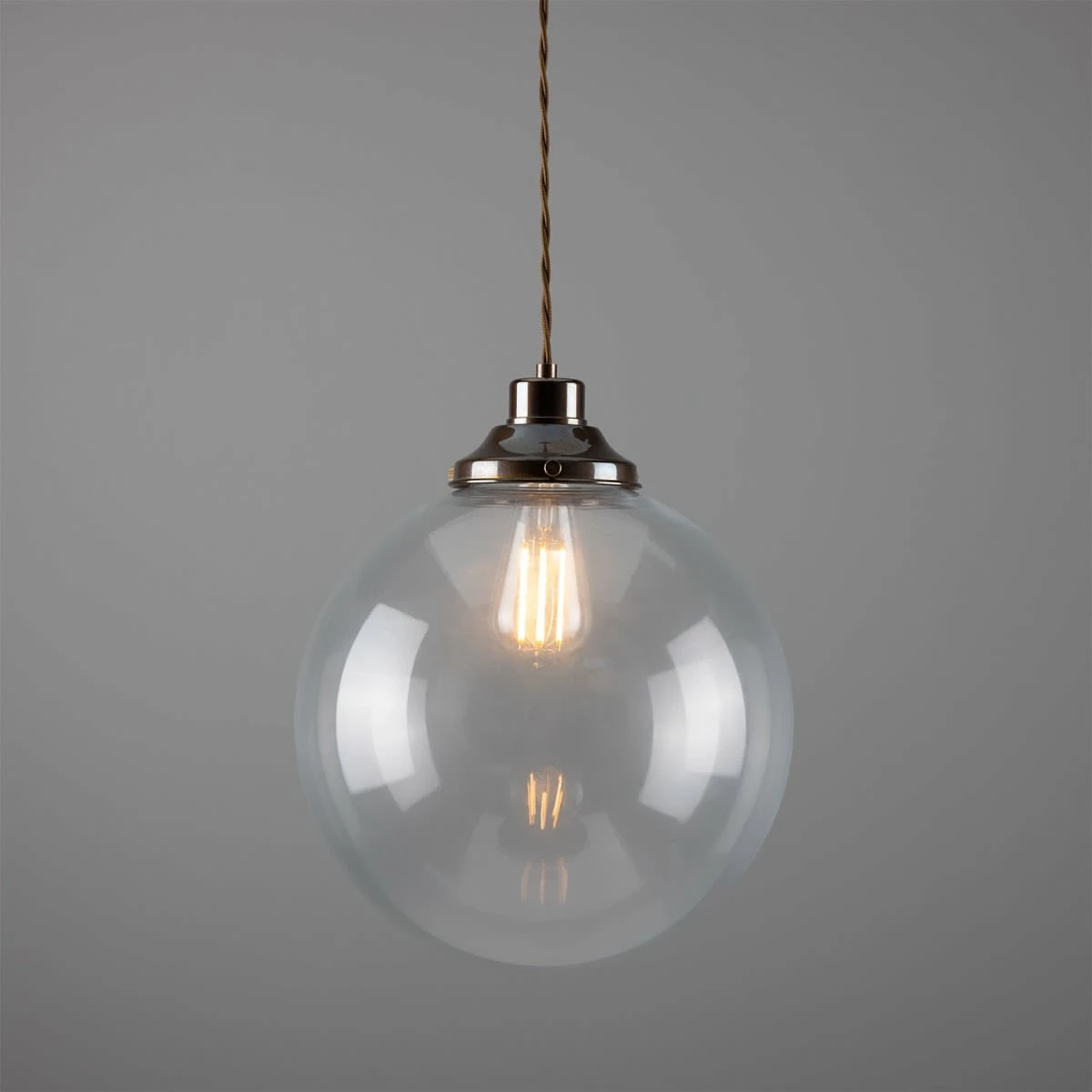 Colour options for the Virginia clear globe pendant include antique brass, antique silver, polished brass, polished chrome, satin brass and satin chrome.
