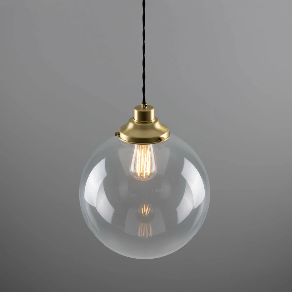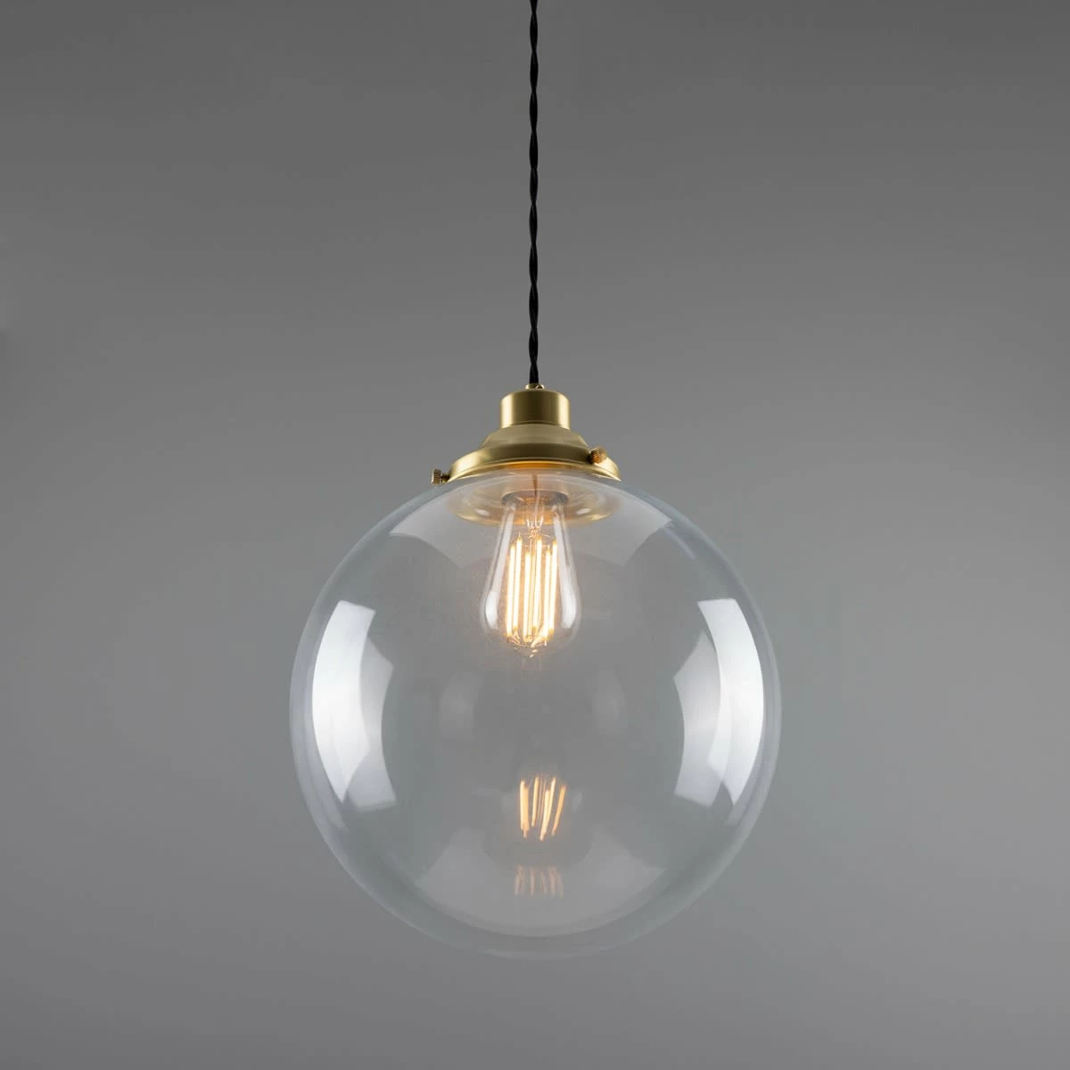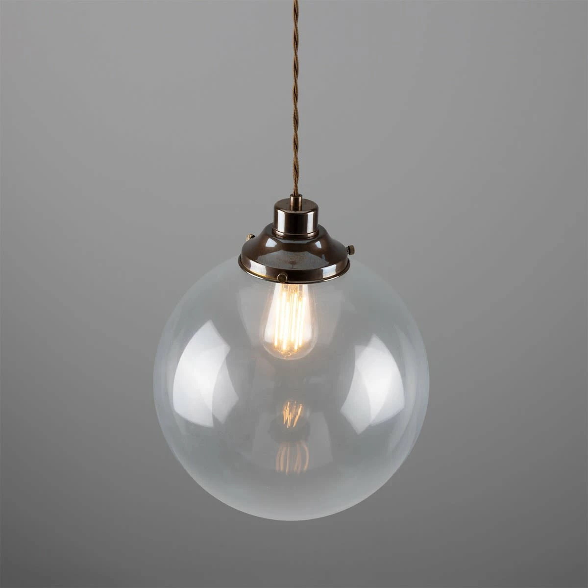 The 30cm Virginia clear globe pendant is an industrial-inspired pendant light designed to be the focal point of any room. A vintage gallery supports a large, clear glass globe that subtly diffuses light and softens its harshness in its immediate environment.