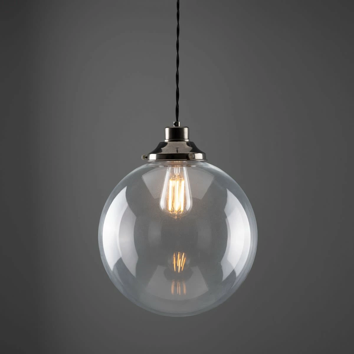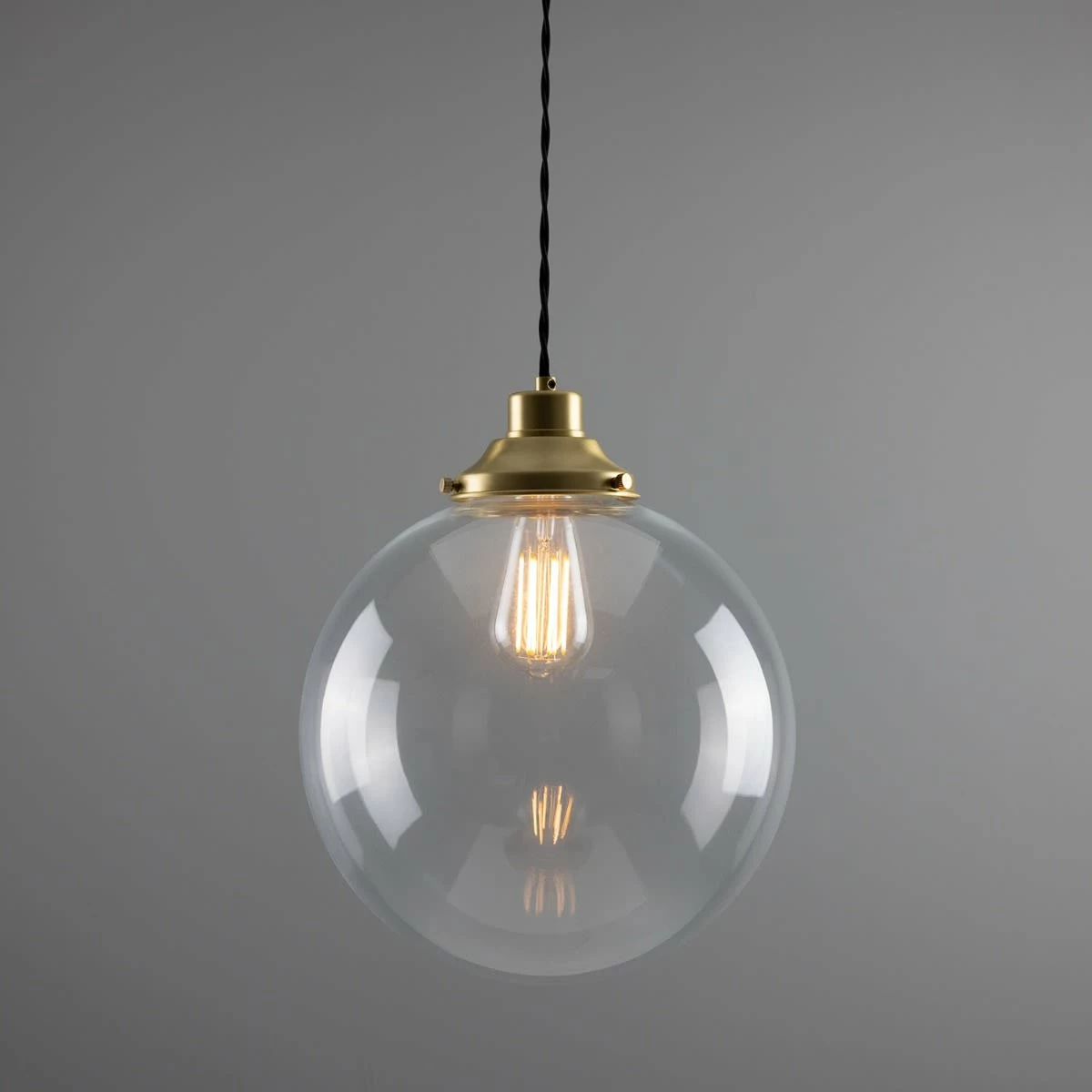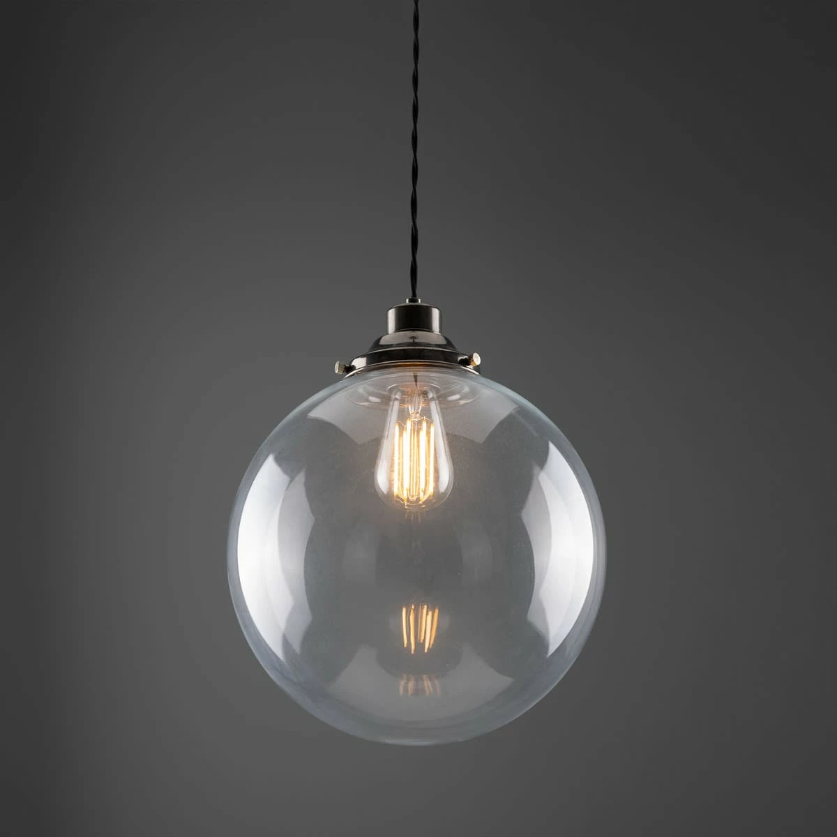 The 30cm Virginia clear globe pendant is an industrial-inspired pendant light designed to be the focal point of any room. A vintage gallery supports a large, clear glass globe that subtly diffuses light and softens its harshness in its immediate environment.