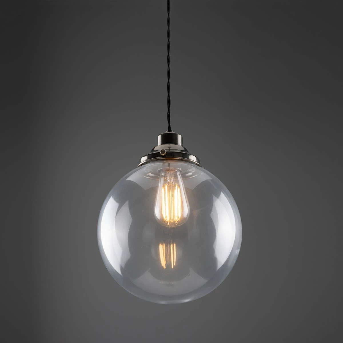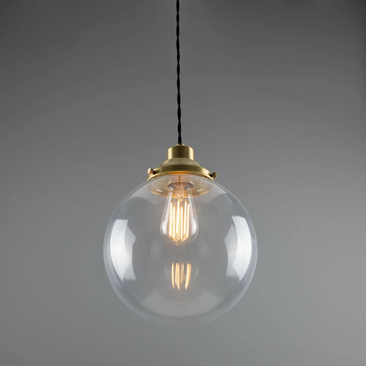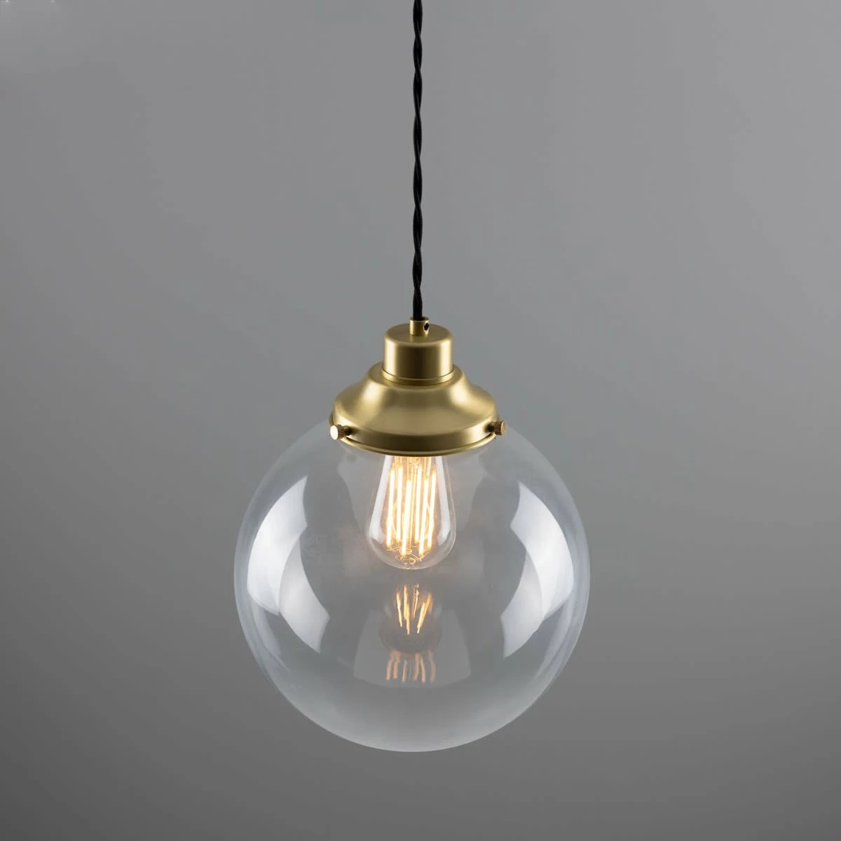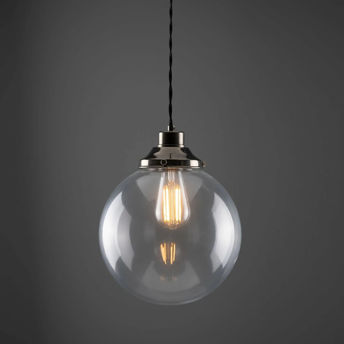 The 25cm Virginia clear globe pendant light is a classic, industrial-inspired pendant. A traditional-style gallery supports a clear glass globe that adds an understated beauty to any space with soft ambient light. Suspended from the supplied ceiling rose with one metre of twisted fabric cable, this contemporary pendant light can be hung individually or together in groups of three or five.