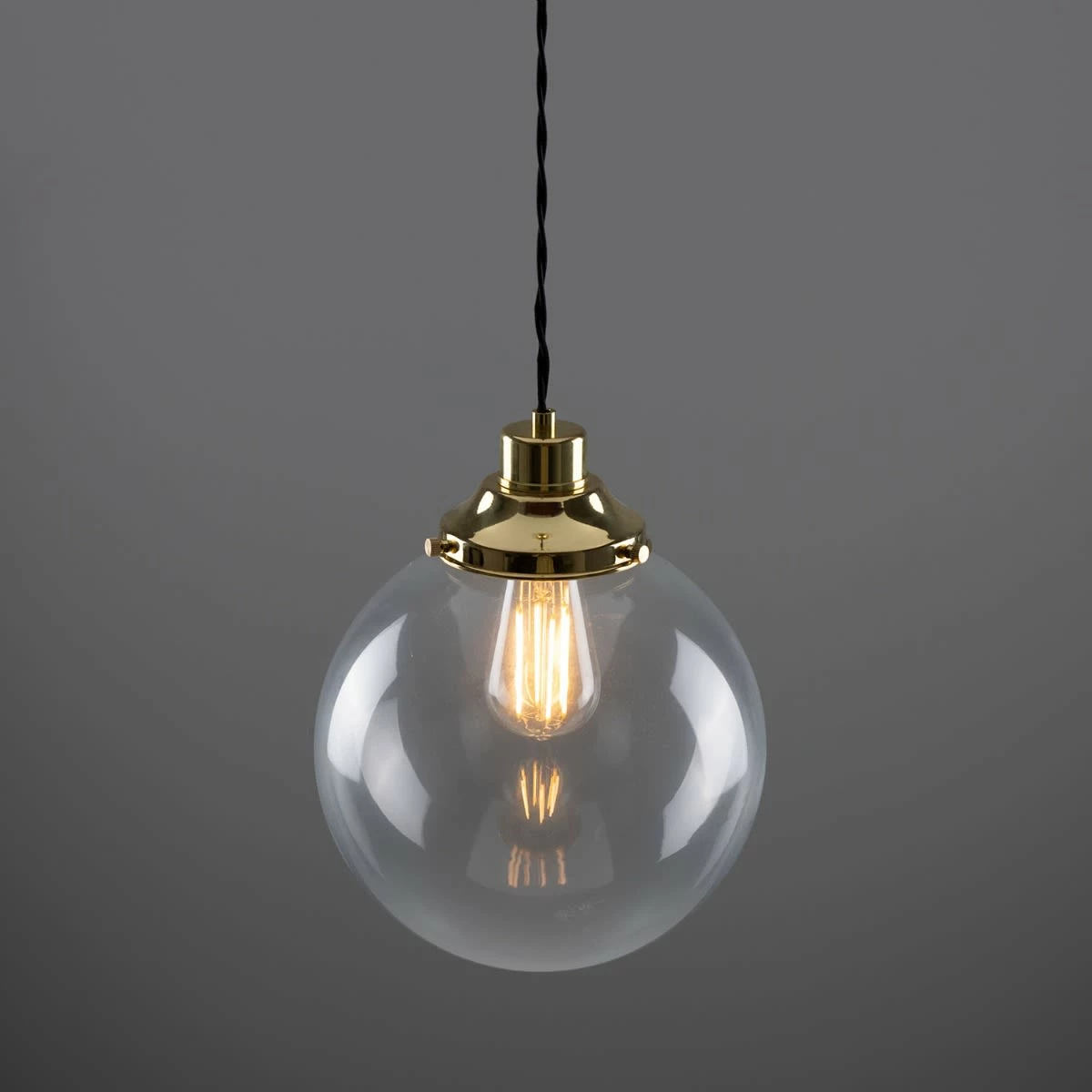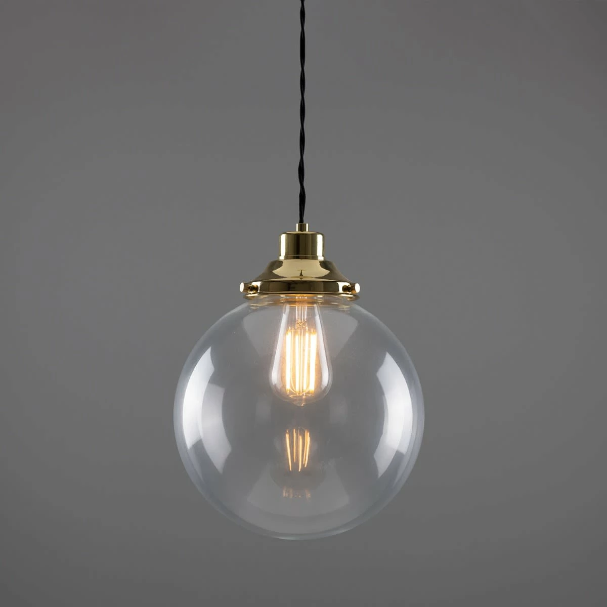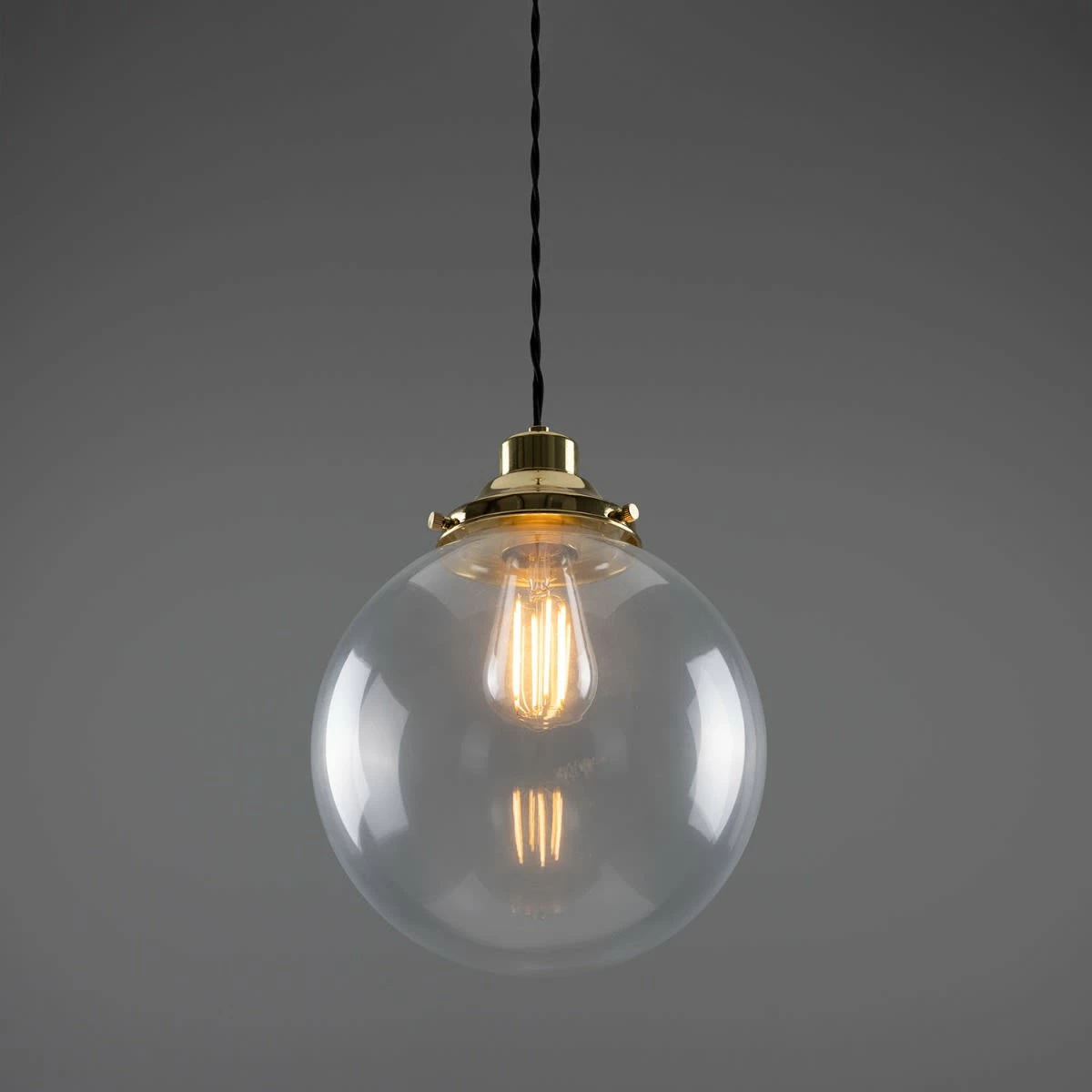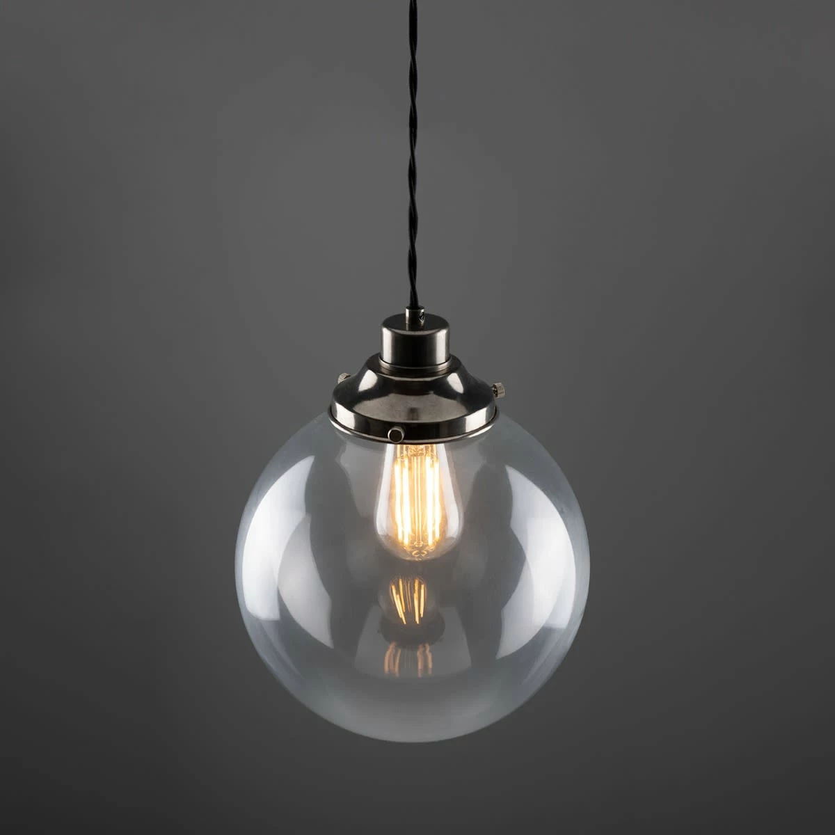 The 25cm Virginia clear globe pendant light is a classic, industrial-inspired pendant. A traditional-style gallery supports a clear glass globe that adds an understated beauty to any space with soft ambient light. Suspended from the supplied ceiling rose with one metre of twisted fabric cable, this contemporary pendant light can be hung individually or together in groups of three or five.