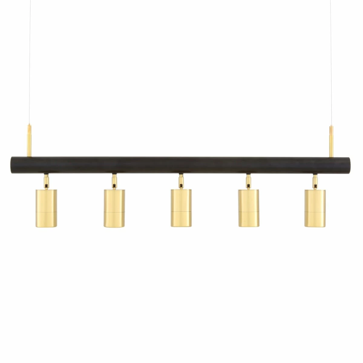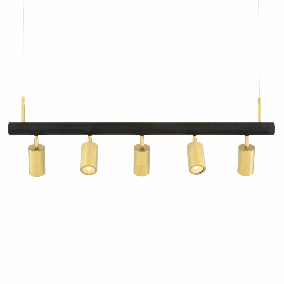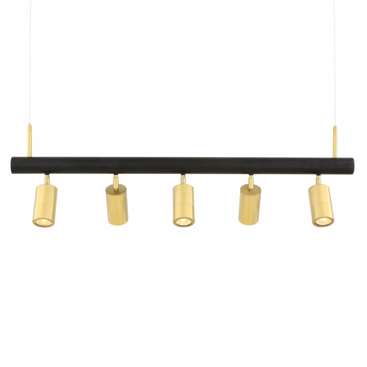 The Watson island pendant is suspended from two separate strands of strong catenary wire and supplied satin brass ceiling roses. A steel tube is powder-coated black with brass end caps from which five cylindrical satin brass lights are attached. Each light can be adjusted independently as required.