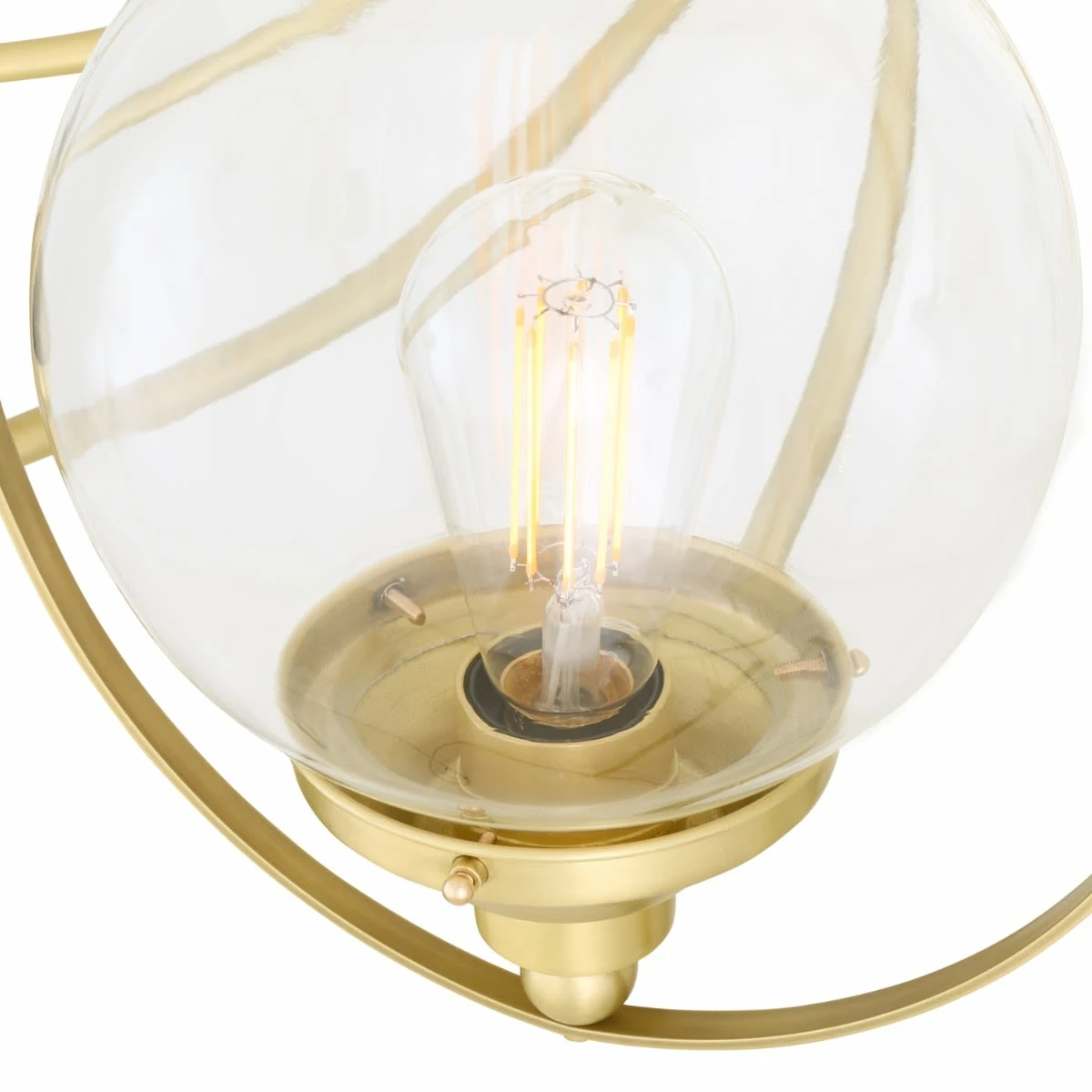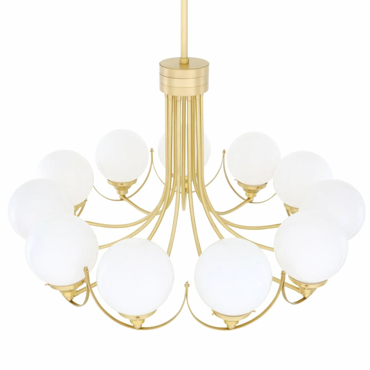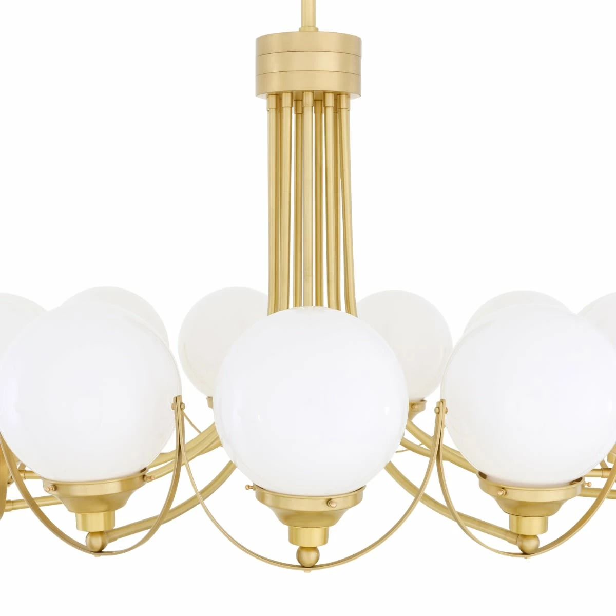 The Wilmot is an impressive globe chandelier with 11 arms. Each arm descends from a central body and curves outwards in a radiant pattern. At the end of each arm a brass gallery – attached to a ball joint – holds a 20cm glass globe in an upward position. The globe can be ordered in clear or opal colour.